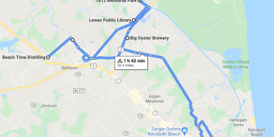 Enjoy a tour of some of Delaware’s favorite breweries and distilleries on this mostly flat and clear trail. Use your Bike & Stay coupons to receive discounts on tastings and more Note: Pick up the new Lewes-Georgetown trail (not yet in Google maps)at the Lewes Public library to go to Beach Time distilling.