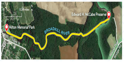 Paddlers’ notes: The recommended paddle is from Milton Memorial Park to the Edward H. McCabe Nature Preserve and back to Milton. There is a floating dock and picnic area at the McCabe Preserve. Please abide by the preserve rules when visiting.